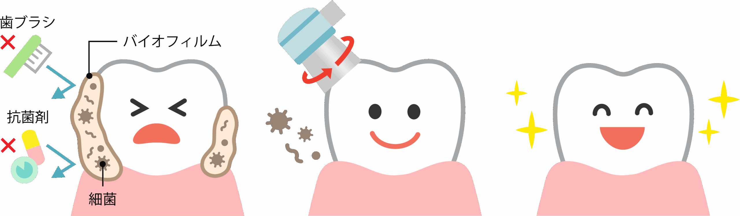 キッチンやお風呂の排水溝のヌメヌメ。あれが「バイオフィルム」です。強力なバリアに守られた細菌の集団であり、うがい薬などの薬剤もなかなか浸透しません。このバイオフィルムを物理的に破壊し、除去できるのは歯科医院の専用器具です。